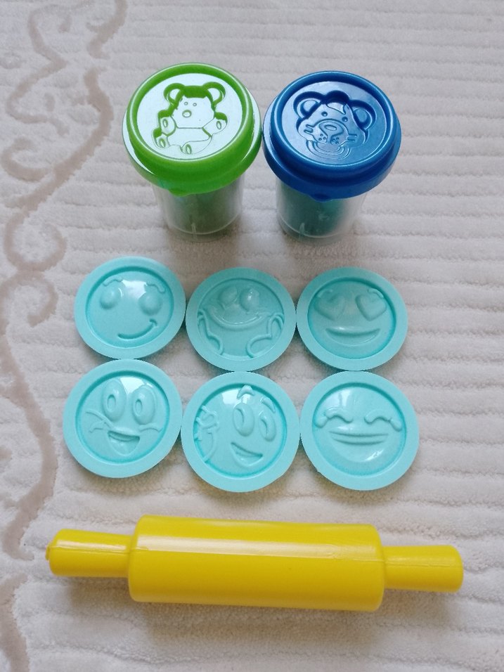 Pastel mavi figürlü oyun hamuru kalıpları ve şekillendirme için sarı merdaneden oluşan eğitim seti. Yaratıcılığı destekler.