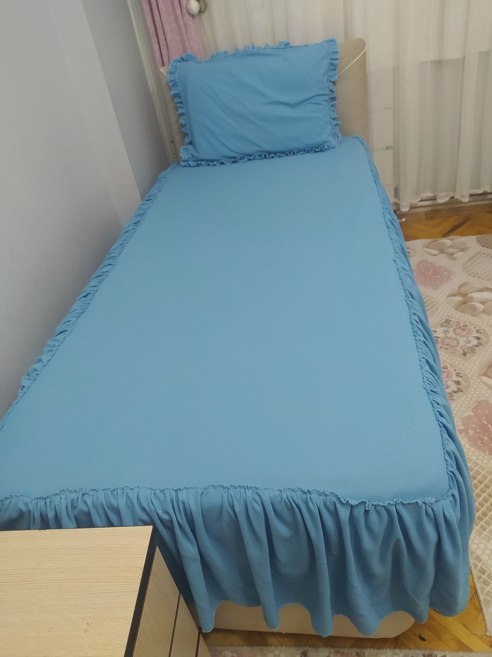 Pastel mavi, fırfırlı kenarlara sahip, tek kişilik yatağa uygun yatak örtüsü. Kumaşı yumuşak ve düzgün bir görünüm sağlar. ️yatak ölçüsü 90 en 190 boy yeri esnek bir kumaş daha büyük yatagada hafif esneyerek olur