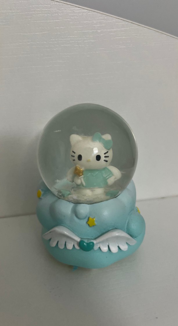 Pastel mavi renkte, Hello Kitty figürlü kar küresi. Tabanında yıldız ve kanat detayları bulunur, sevimli bir tasarıma sahiptir. ❄️(Işığı bozuldu)