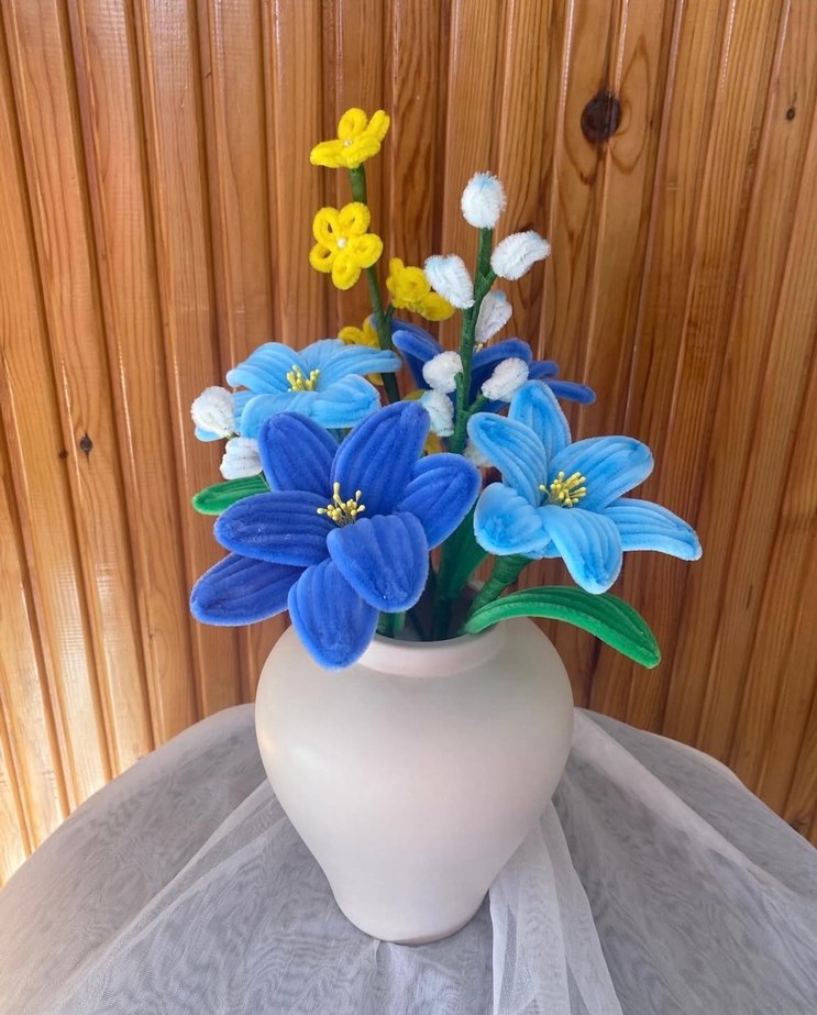 Beyaz vazoda pastel mavi kadife çiçek aranjmanı, sarı ve beyaz küçük çiçeklerle tamamlanmıştır. Vazo görsel amaçlıdır,isteğe göre buket yapılabilir.