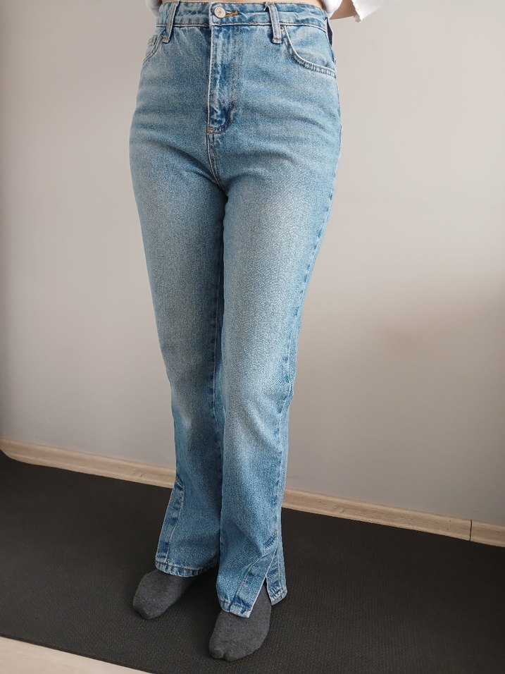 Pastel mavi renkte, normal kesim ve midi boyda, paça kısmında küçük yırtmaç detaylı denim pantolon, günlük kullanıma uygun rahat ve şık bir modeldir.