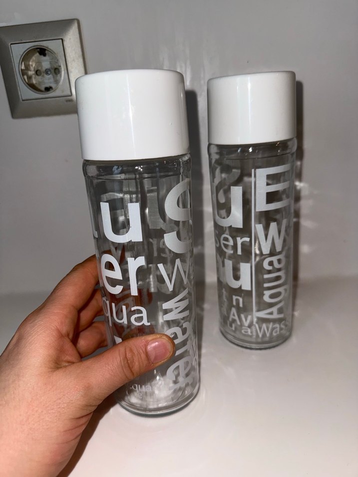 Pastel mavi kapaklı, üzerinde beyaz yazılar bulunan şeffaf su şişeleri. Bir kapağı çıkarılmış şekilde gösterilmektedir.
