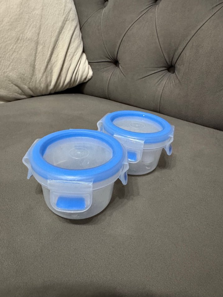Pastel mavi kapaklı, yuvarlak ve kilitli saklama kaplarıdır. Artan yiyecekler veya atıştırmalıklar için uygundur. Tefal marka
