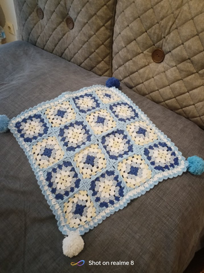 Pastel mavi kareli, köşelerinde ponpon detayları olan yumuşak örgü el örgüsü yastık kılıfı Mudo model satılık şahane