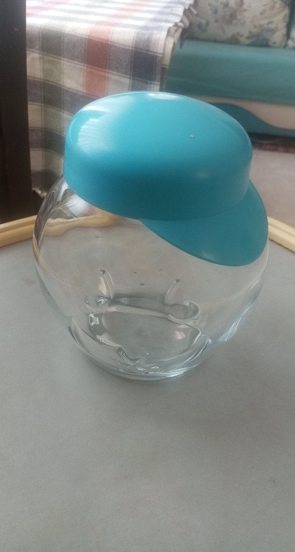 Pastel mavi kapaklı, şeffaf cam kedi figurlu Kavanoz