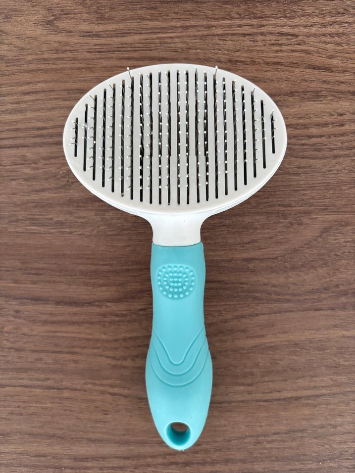 Pastel mavi renkte, ince metal kıllara sahip ve rahat saplı kedi tüy fırçası.