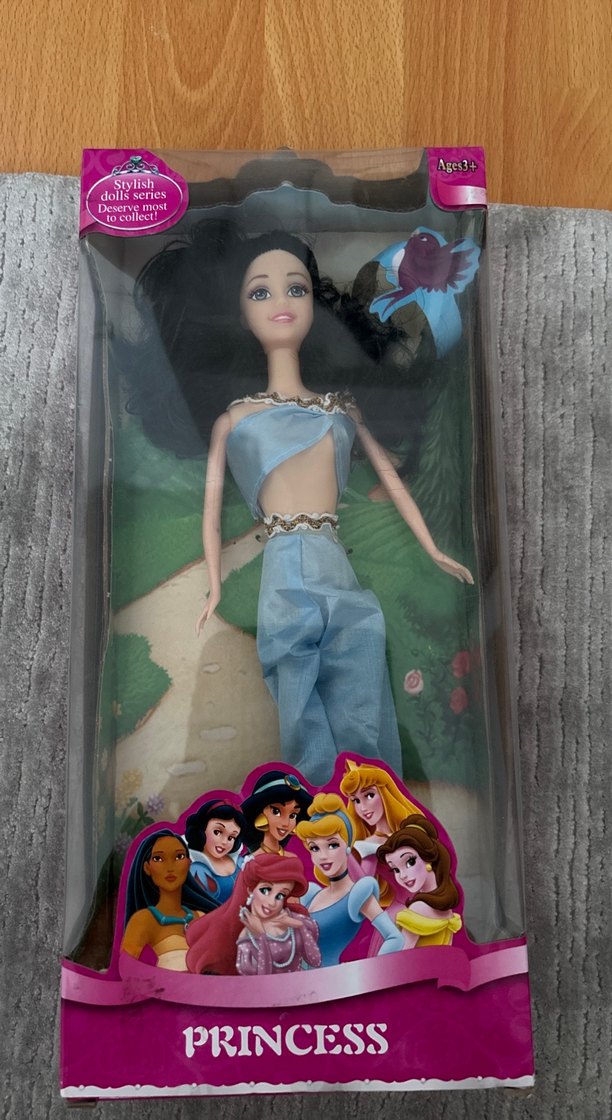 Pastel mavi kıyafetli bebek, 3 yaş ve üzeri için uygun. Renkli arka plan ve karakter illüstrasyonlarıyla kutuda sunulur.