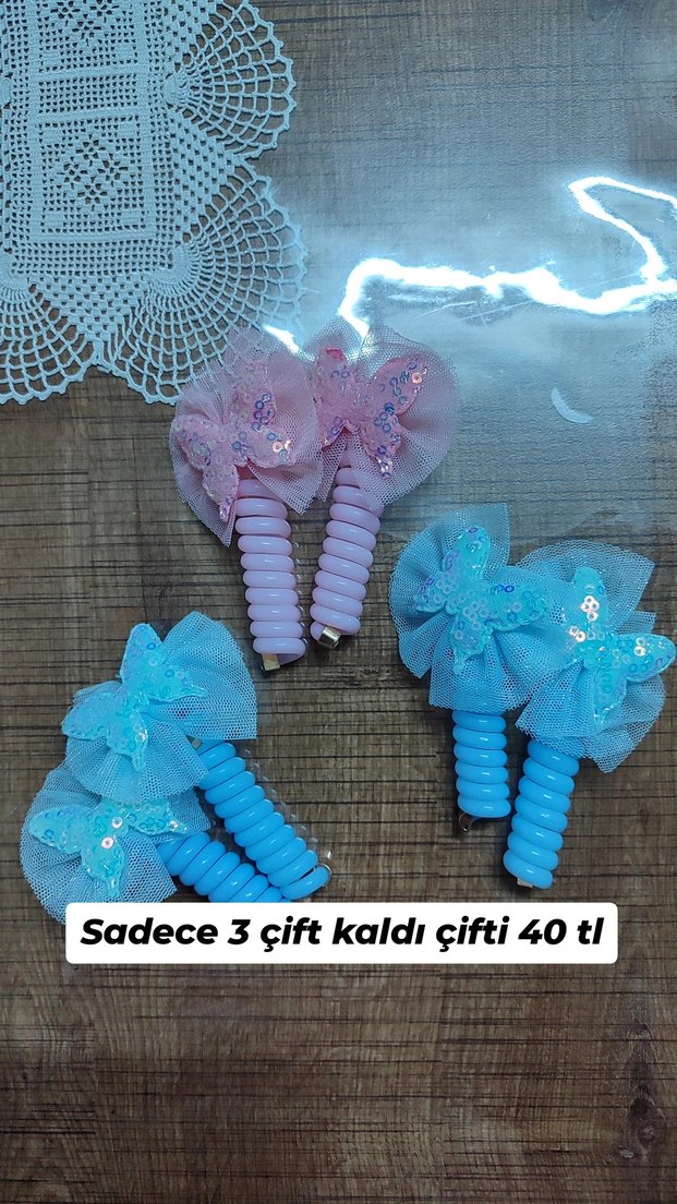 Pastel mavi ve pembe plastik saç tokaları, kurdele ve payetli kelebek detaylarına sahiptir. Sadece 3 çift kaldı, çift fiyatı 40 TL.