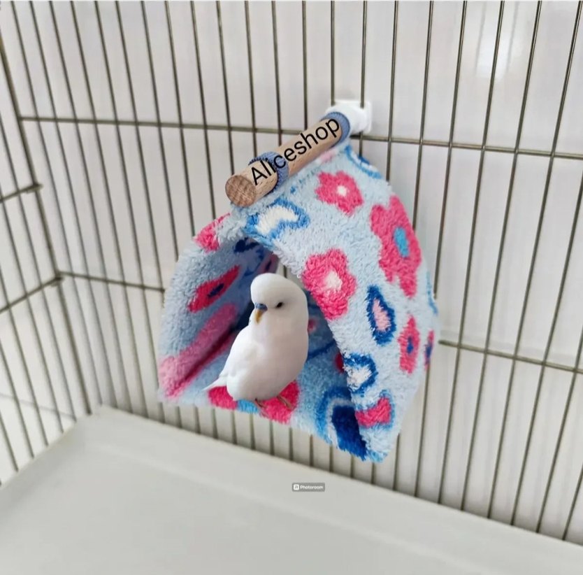 Pastel mavi, yumuşak ve renkli çiçek desenli küçük kuşlar için oyun ve yatak evi. Rahat asma tasarıma sahiptir.