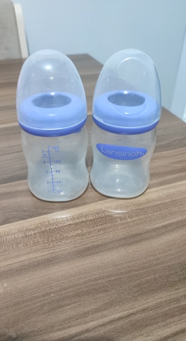 Lansinoh marka pastel mavi kapaklı, ölçü işaretli şeffaf bebek biberonlarıdır. Alt kısımlarda ufak çizikler var. Bir biberonda ve halkasında iz var. Ocağın sıcak kenarına düşmüştü.
