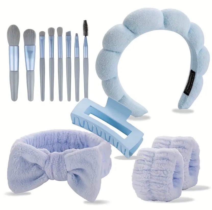 Pastel mavi tonlarda yumuşak kıllı makyaj fırçaları, peluş saç bandı, toka ve bilekliklerden oluşan set.