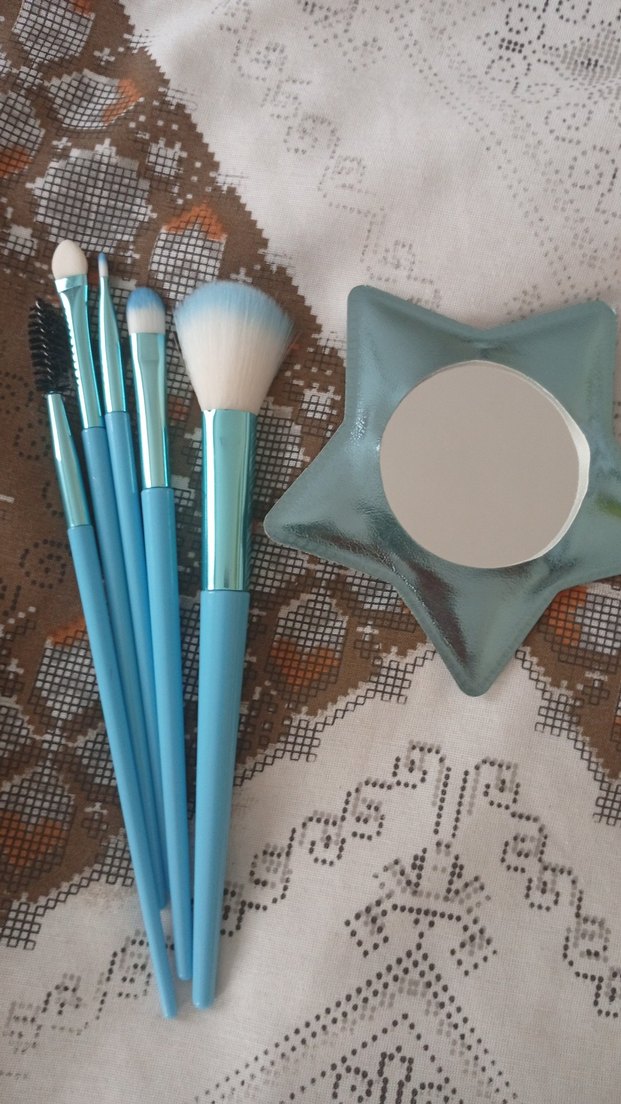 Pastel mavi tonlarında, yumuşak kıllı makyaj fırçaları ve yıldız şeklinde küçük bir ayna seti.