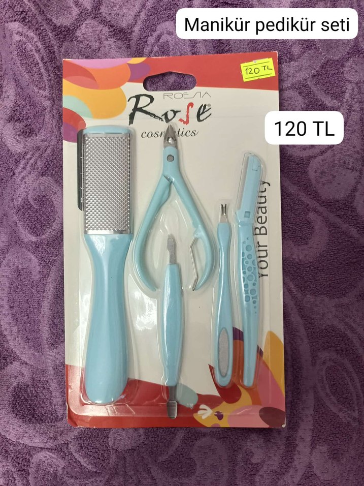 Pastel mavi renkte, tırnak makası, tırnak törpüsü, itici ve cımbız içeren manikür pedikür seti. Temel tırnak bakım araçları sunar.