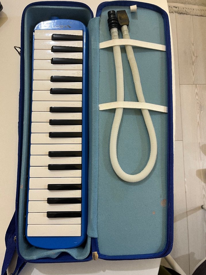 Pastel mavi renkte melodika, taşıma kılıfı ve esnek ağızlık borularıyla birlikte gelir.