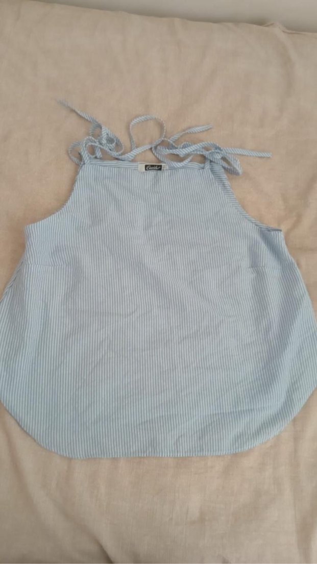 Pastel mavi renkte, hafif ve yumuşak kumaştan yapılmış mutfak önlüğü. Boyun ve belde bağlama detayları bulunur.