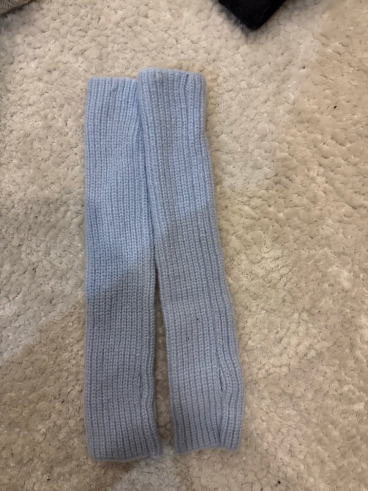 Yumuşak örgü kumaştan yapılmış, pastel mavi renkli, rahat ve temel stile sahip örgü kadın eldivenler.