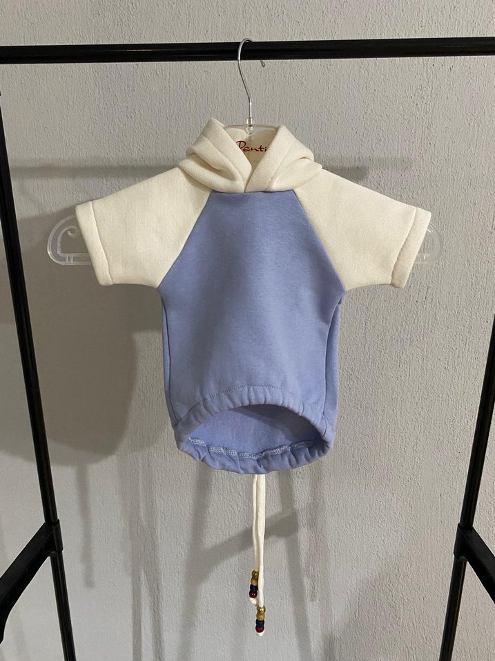 Pastel mavi ve krem renklerde, kollu örme kapüşonlu köpek kıyafeti, baskılı desenle rahat bir sokak giyim tarzı sunar.