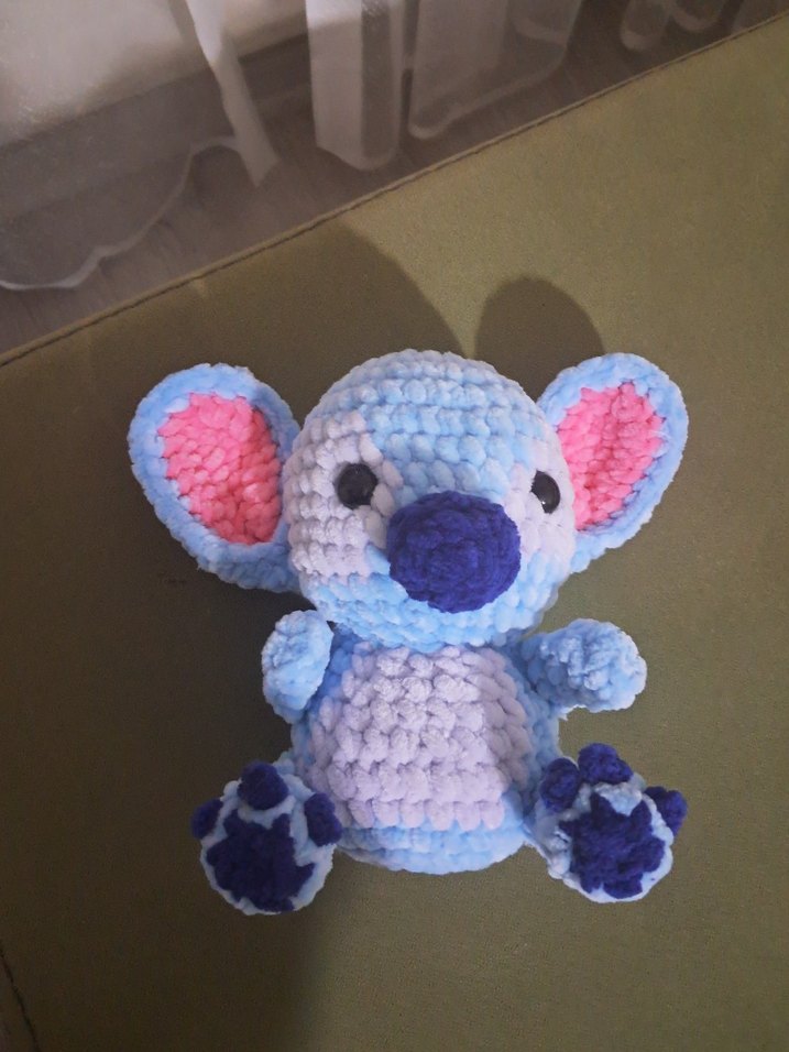 Yumuşak pastel mavi peluş koala oyuncak, pembe kulak içi ve koyu mavi burun ile pati detaylarına sahip. #stitch kendim ördümm