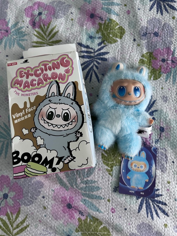 Pastel mavi renkte, yumuşak tüylü peluş oyuncak. Büyük mavi gözleri ve küçük kulakları var. kutusu ve etiketi ile birlikte.