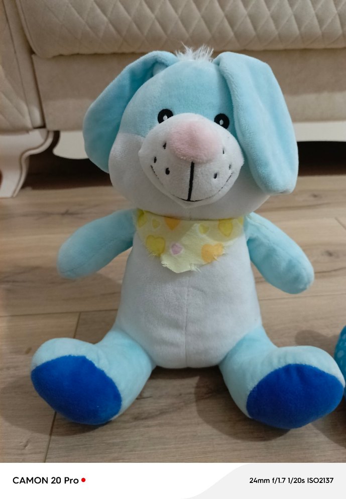 Pastel mavi renkte, yumuşak peluş tavşan. Sarı desenli fular takıyor, pembe burunlu ve mavi ayaklı.