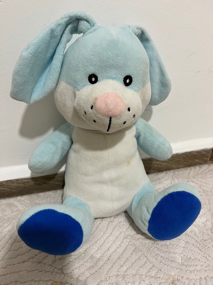 Yumuşak pastel mavi peluş tavşan oyuncak, uzun kulaklı ve pembe burunlu. Nakış siyah gözlere sahip, sevimli bir yüz ifadesi var.