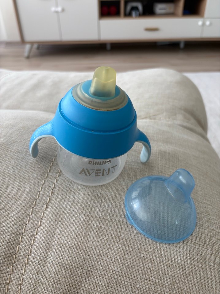 Kolay tutuş için kulplu ve yumuşak emzikli pastel mavi Philips Avent bebek biberonu. Koruyucu kapağı mevcuttur.