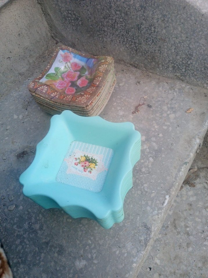 Pastel mavi renkli, kapağında çiçek desenli plastik çay tabağı ı, yumuşak ve pürüzsüz dokulu. iki takım