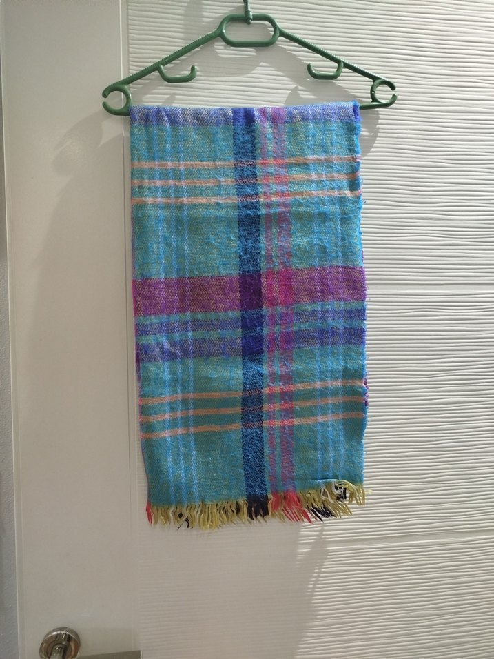 Pastel tonlarda mavi renkli, bağlama desenli ve uçlarında yumuşak püsküller bulunan kışlık şal