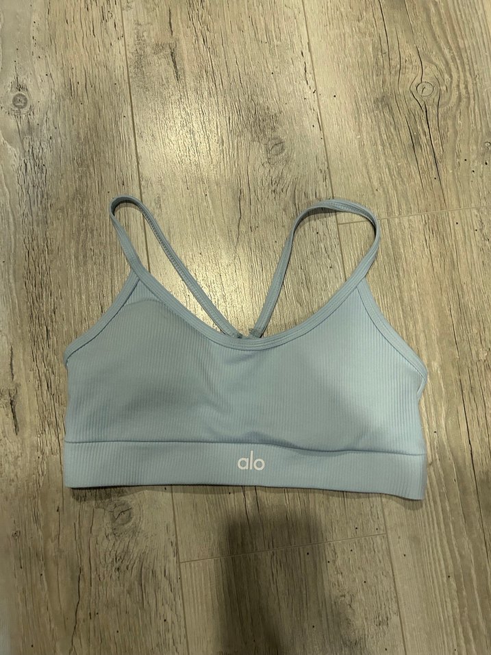 Pastel mavi renkte, ince askılı ve "alo" logosu bulunan sade spor sütyeni. Streetwear ve athleisure tarzına uygun.