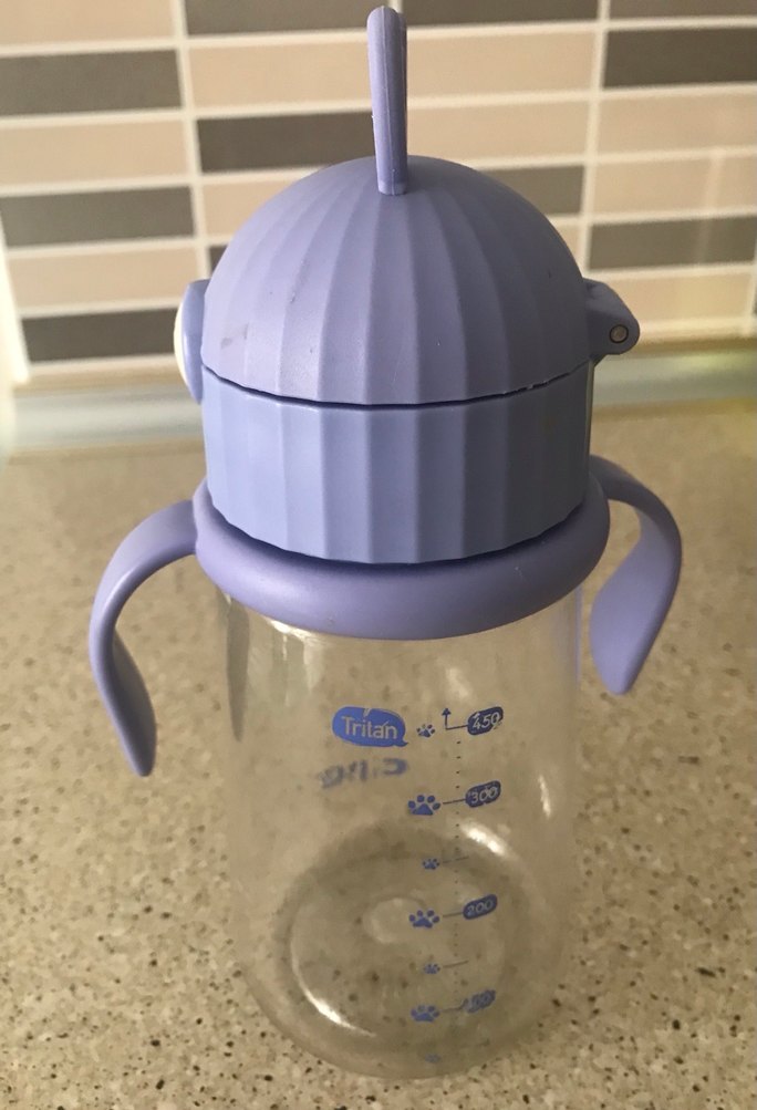 Dayanıklı Tritan malzemeden yapılmış pastel mavi renkli, rahat tutuş sağlayan saplara sahip suluk.