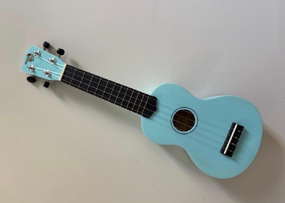 Aynı görselde gördüğünüz gibidir. Pastel mavi renkte, koyu renk perdeli ve yumuşak gövdeli ukulele.