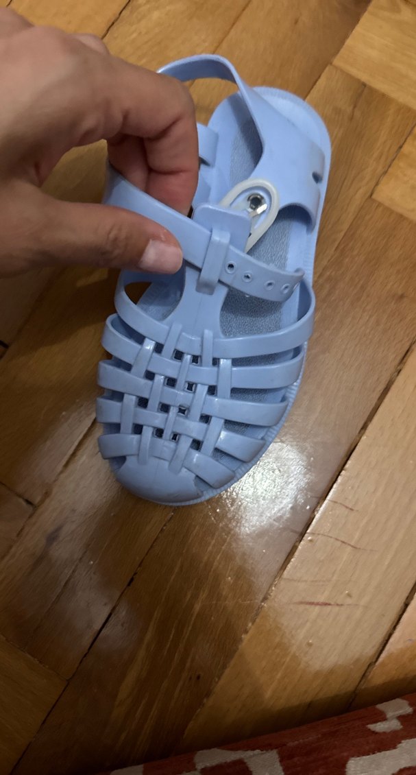 Pastel mavi renkli, kauçuk malzemeden yapılmış, tokalı ve örme desenli unisex çocuk sandaletidir. Günlük sokak stiline uygundur.