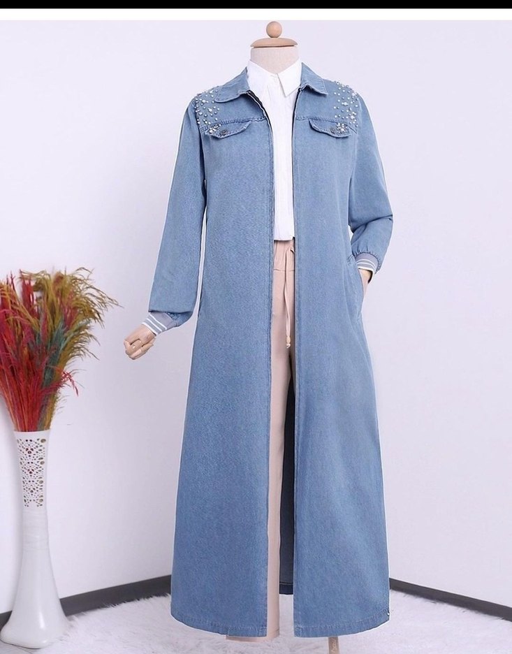 Pastel mavi uzun denim kaban, yakalı ve fermuarlı tasarlanmıştır. Uzun kollu, rahat kesim ve günlük sokak stili için uygundur. Göğüs ceplerinde süslemeler bulunur.