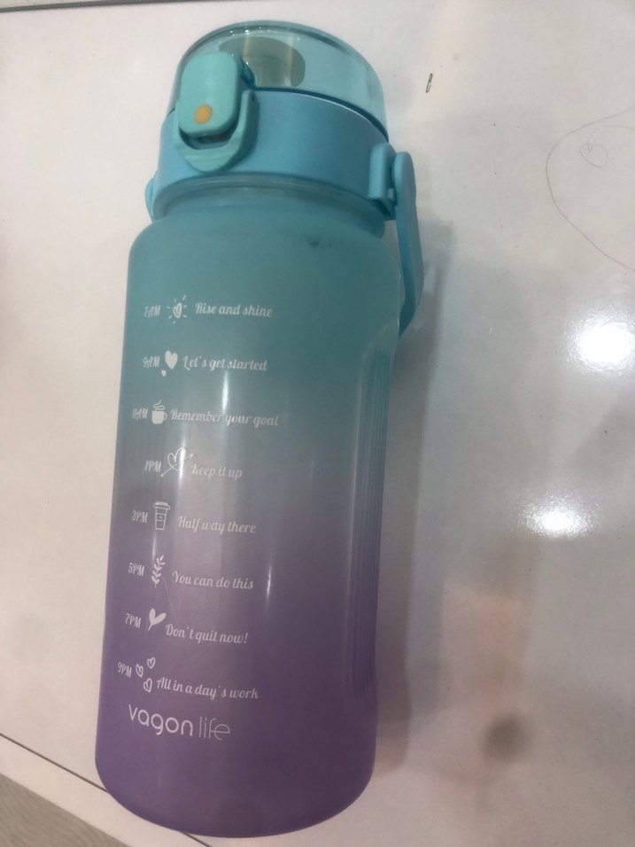 Vagonlife markalı, pastel mavi renkli, zaman işaretleri ve taşıma kayışı bulunan su şişesi. Güvenli kapaklıdır. 1500ml