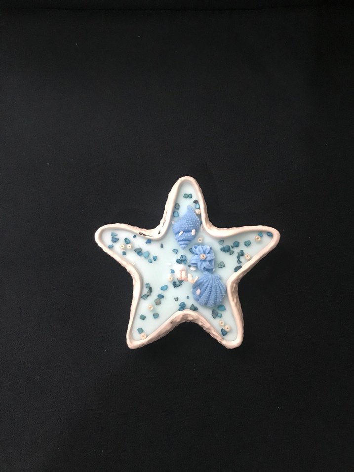 Pastel mavi renkte, yıldız şekilli, küçük mavi süslemeler ve deniz kabuğu detayları içeren mum. Sakin ve dekoratif bir hava katar. ️okyanus kokulu