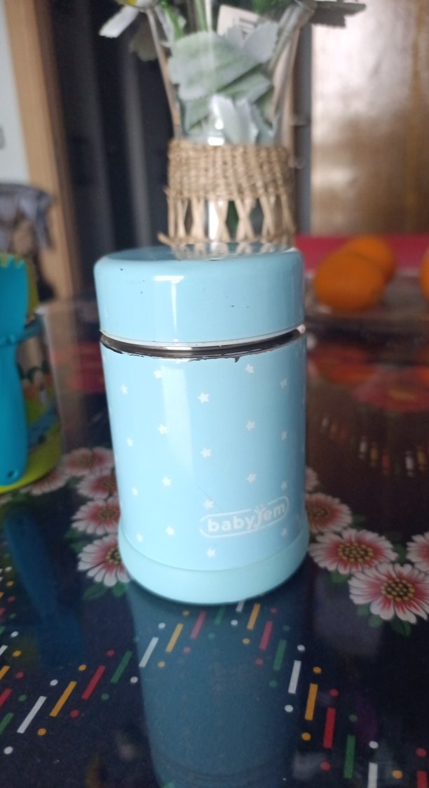 Pastel mavi renkte, yıldız desenli ve kapaklı pratik yemek kabı. sorunsuz altında contası var contası çıkıyor diyor takılıyor yumuşak zemin olması açısından temiz kullanıldı hiçbir sorunu yok