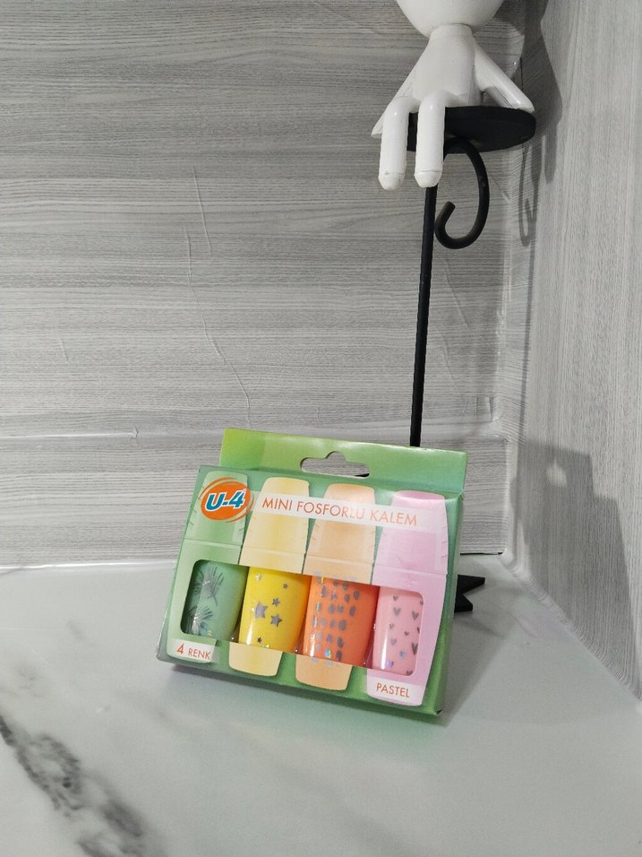 Dört farklı pastel renkte mini fosforlu kalem seti. Her kalem desenli ve kullanımı kolaydır. Üzerinde "MINIFOSFORU KALEM" yazısı bulunmaktadır. ✨