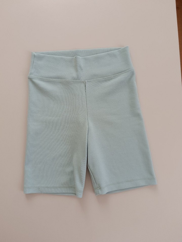 Beli yüksek, pastel renkte, yumuşak sentetik kumaştan yapılmış, sportif sokak stili için uygun dar kesim mini tayt.