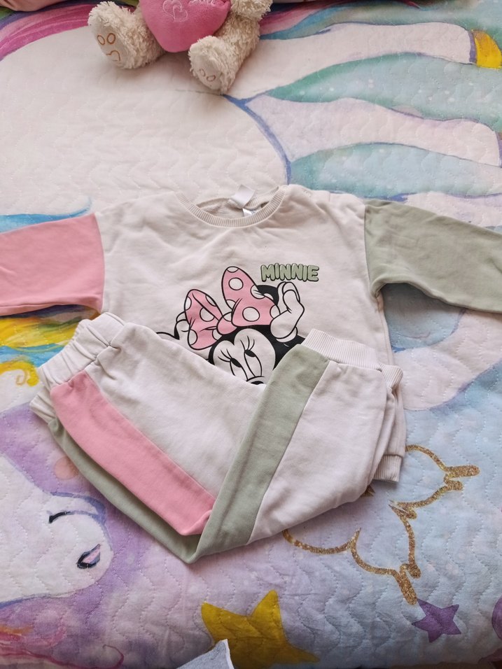 Pastel renklerde, Minnie baskılı uzun kollu bebek kız takımı. Kolay giydirme için cırt cırtlı pantolon içerir. Yumuşak ve rahat kumaşla üretilmiştir.