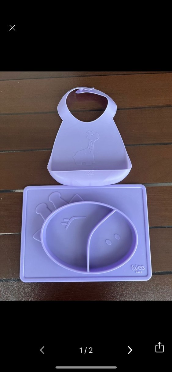 Pastel mor renkte, zürafa desenli bölmeli tabak, masa altlığı ve önlükten oluşan yumuşak ve güvenli bebek mama seti. Az kullanıldı yepyeni Fda onaylı
