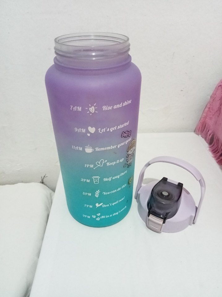 Pastel mor renkte, gün içerisindeki su içme saatlerini hatırlatan yazılarla tasarlanmış bebek şişesidir. Taşıma için güvenli kapağı bulunmaktadır.