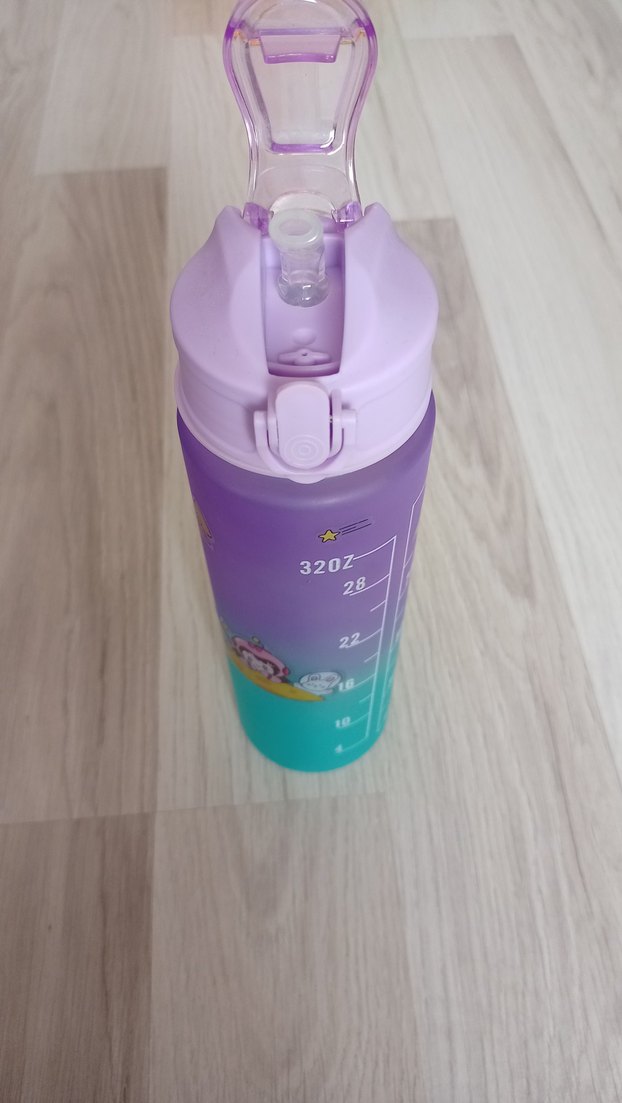 Pastel mor renkte, güvenli kapaklı ve 32 oz ölçü işaretli suluk. Yumuşak ağızlığı kolay içim sağlar.