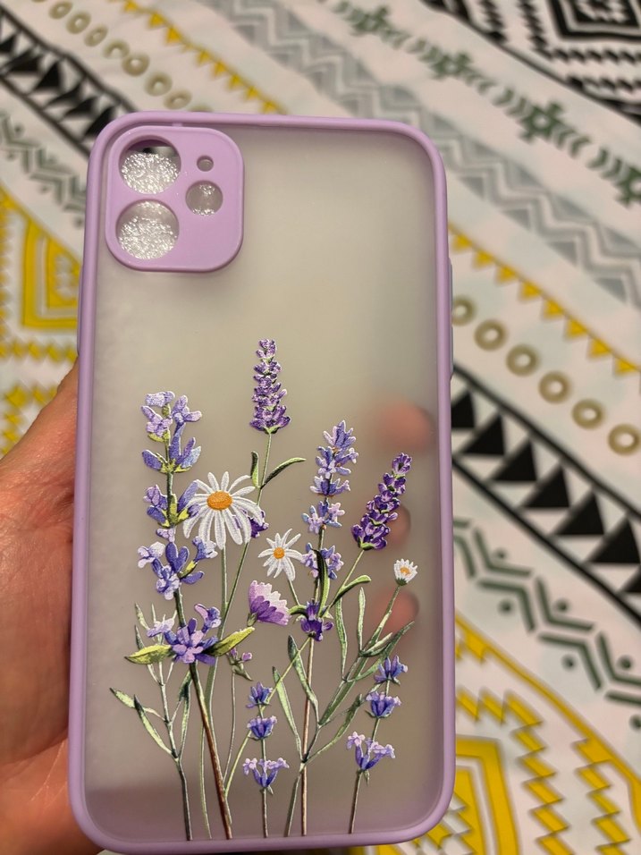 Pastel mor renkte, boncuklu lavanta ve papatya çiçekleri desenli, bohem tarzda telefon kılıfı. Apple11
