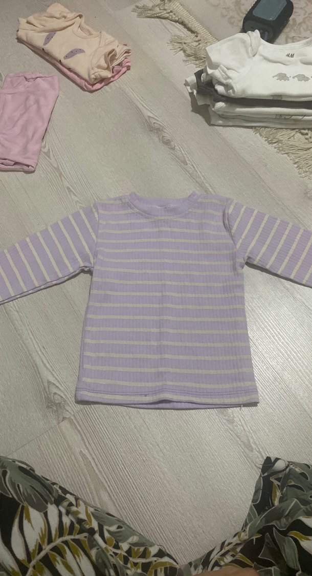 Uzun kollu, pastel mor ve krem çizgili çocuk içliği, rahat ve yumuşak kumaştan üretilmiştir. Katmanlama için uygundur.