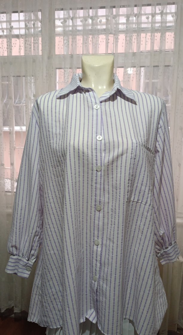 Pamuk kumaştan yapılmış, düğmeli uzun kollu, yakalı ve pastel mor çizgili uzun kesim kadın gömleği. Rahat kesimi ofis ve günlük kullanım için uygundur. l xl uyumludur