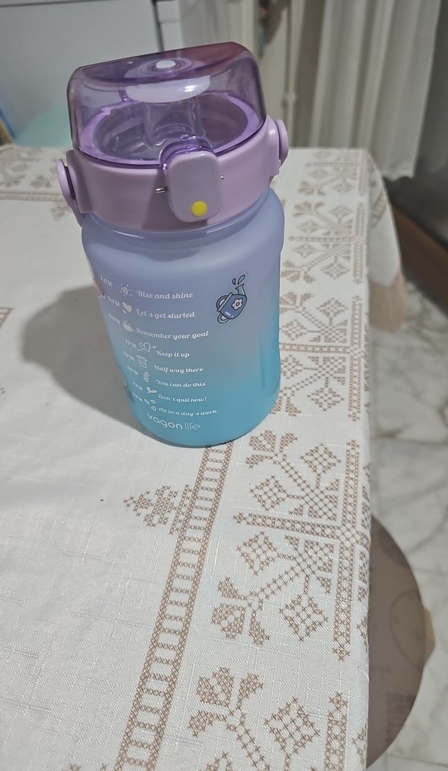 Pastel mor renkte, güvenli kapaklı ve motivasyonel zaman işaretleri olan suluk. Pürüzsüz, dayanıklı plastikten yapılmıştır. vagon life markası
