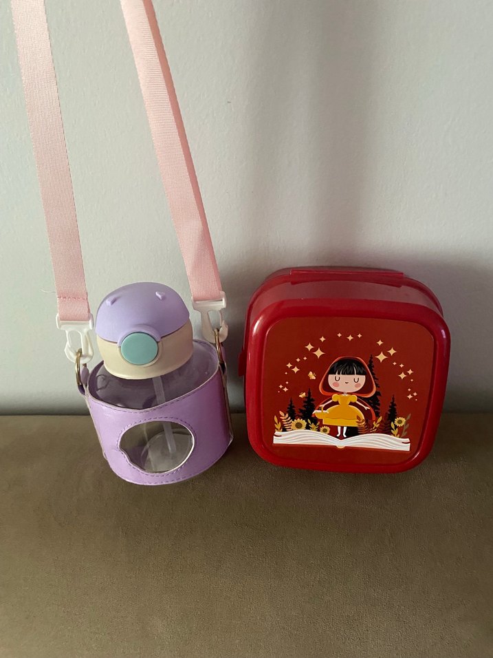 Pastel mor renkli, taşıma askılı çocuk termos şişesi ve üzerinde sevimli kız resmi olan kırmızı kutu seti. Çocuklar için içecek ve atıştırmalık taşıma kolaylığı sağlar. Beslenme kutusunun köşesinde çatlak var ama kullanmaya engel değildir.