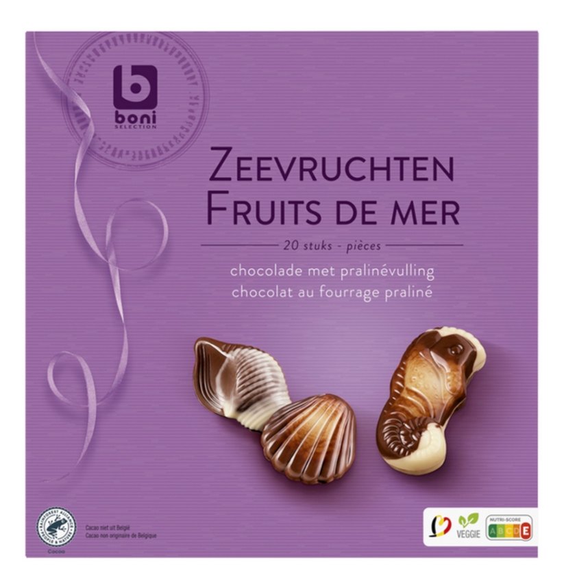 Pastel mor kutuda, pralin dolgulu 20 adet deniz kabuğu şeklinde çikolata. Vejetaryen dostu, Belçika üretimi.