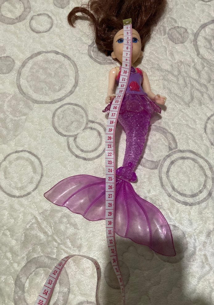 Pastel mor renkte, parlak kuyruğa ve kahverengi saçlı detaylı yüze sahip deniz kızı bebeği. Yaklaşık 30 cm uzunluğundadır. Müzikli idi pil yeri oksitlenmiş tamir edilirse belki çalışır bu şekilde veriyorum♀️