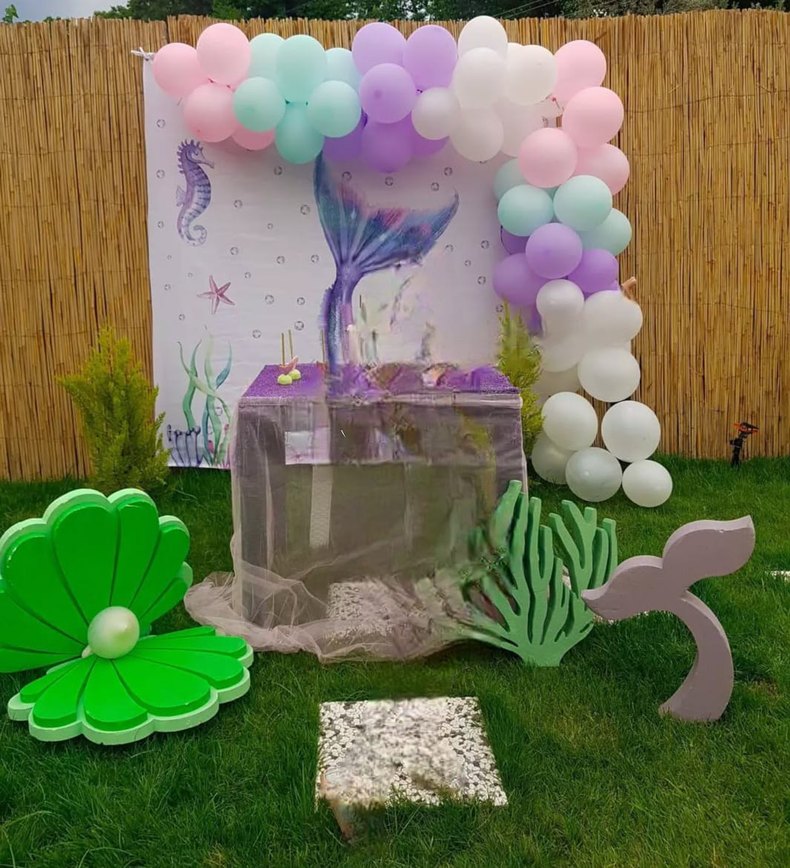 Pastel mor tonlarında deniz kızı temalı balonlar, masa süsleri ve deniz altı figürlü duvar arkası ve deniz kızı kostüm ♀️ ürün içeriği 1 adet kostüm 1 adet maket pasta arka duvar süsü 3 cupcake süsü 3 popkek süsü renkli balon zinciri masa önü süsü midye yosun ve kuyruk süsleri daha fazla bilgi için mesaj atınız